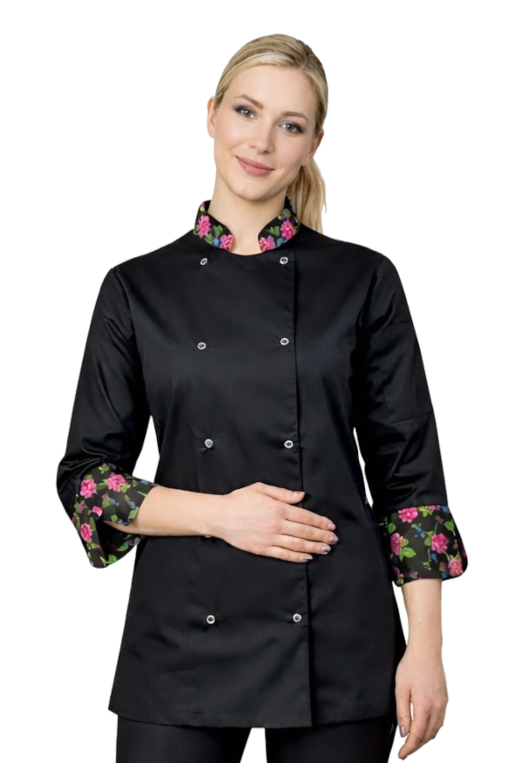 Les blouses de chef sont une partie essentielle de la tenue du chef. Notre dernier design est une blouse de chef avec 3 manches. Fabriquée dans un tissu extrêmement durable et résistant, 65% polyester, 35% coton. La blouse se distingue par des inserts floraux au col et aux poignets réalisés en 100% coton. La blouse a une fermeture éclair confortable. Il y a une poche pratique sur la manche. La blouse est coupée de manière cintrée, c'est pourquoi nous la dédions aux femmes travaillant dans les restaurants, hôtels, pubs, cafés et institutions éducatives.
