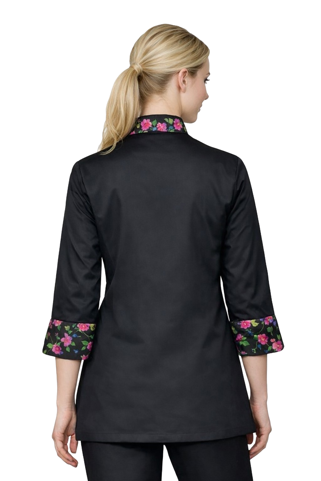 Les caractéristiques inserts à motif floral sur le col et les manchettes (fabriqués en 100% coton) donnent à la blouse un style unique, et la fermeture pratique à boutons pression facilite l'enfilage rapide. Un pochette sur l'épaule gauche est un détail pratique que vous apprécierez sur le lieu de travail.