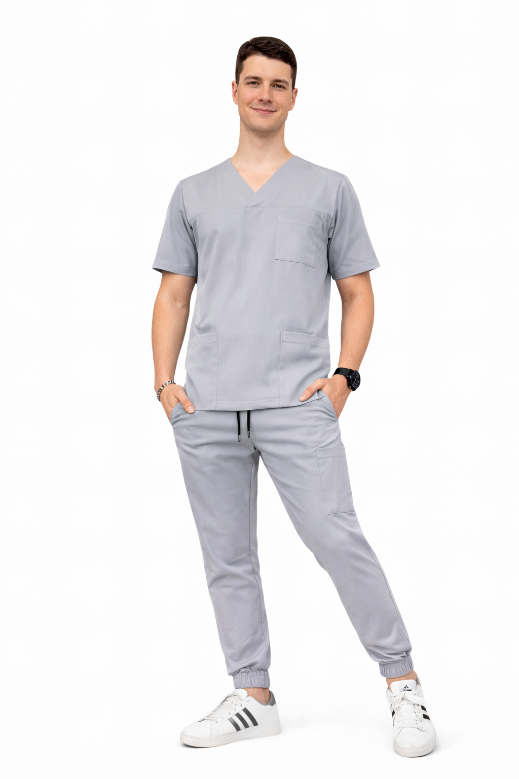 L'ensemble médical masculin Cherokee Stretch en gris foncé est un scrubs masculin premium, qui allie confort, design moderne et qualité élevée du tissu. L'ensemble comprend une blouse médicale kasak et un pantalon jogger, créant un uniforme médical élégant et fonctionnel.