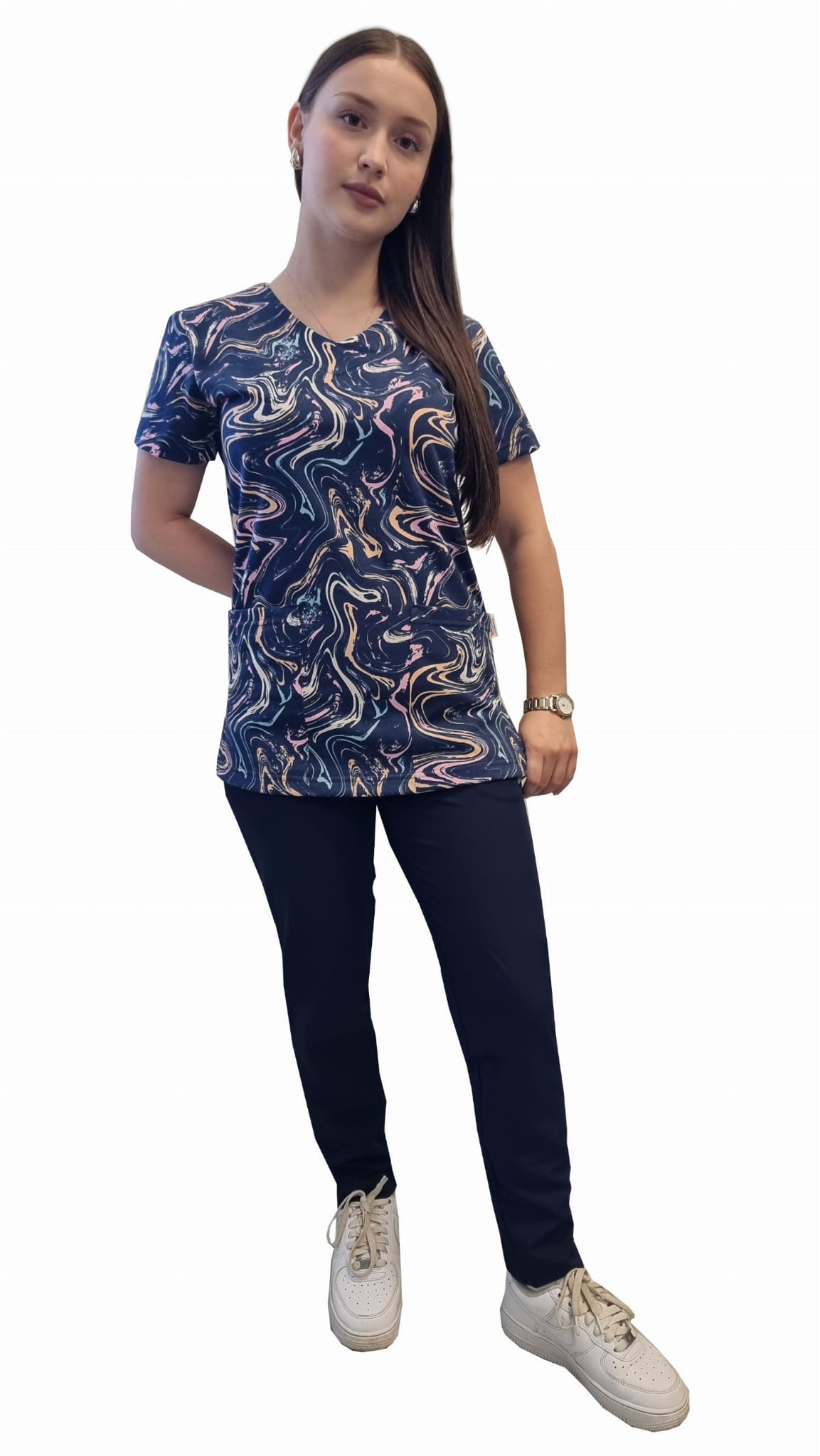 L'ensemble de vêtements médicaux pour femme avec motifs – modèle W16 combine fonctionnalité, confort et design moderne. L'ensemble se compose d'une blouse médicale de la collection ELASTIC BLOOM et d'un pantalon Basic Premium en couleur bleu marine foncé. Ensemble, ils forment un uniforme médical particulièrement féminin, qui se distingue par sa couleur subtile et son motif à la mode, tout en conservant un professionnalisme total.