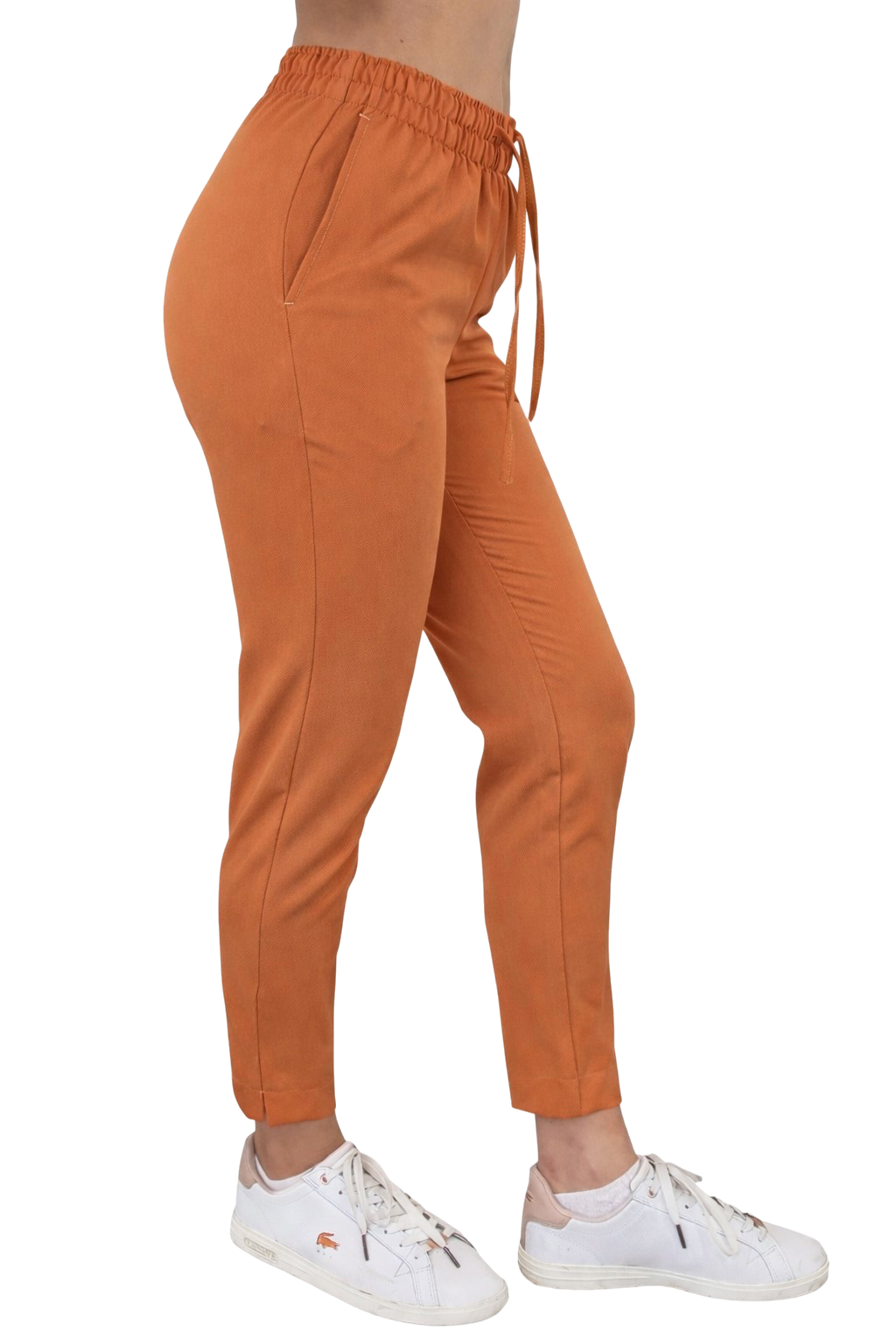 Le pantalon a une coupe cintrée avec des jambes effilées et des fentes élégantes. Deux poches pratiques permettent de ranger les petits objets, et une ceinture élastique avec un cordon assure un ajustement parfait à la silhouette. C'est un modèle qui combine l'élégance avec le confort sportif.